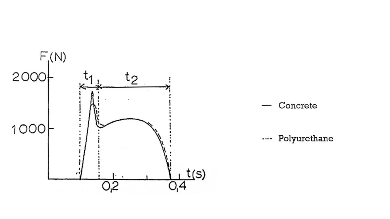 Well, we can’t change the impulse due to the law of conservation, but we can change the peak force by changing the look of this graph. By being barefoot, you transfer much force to the ground in small time frame, that even though we have the same amount of ground contact time, the peak force is high. The point of the midsole is to lower the peak force and spread it across evenly without increasing contact time significantly.