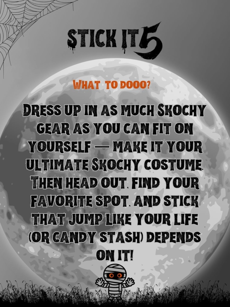 Dress up in as much #SKOCHY gear as you can (or as much as you can handle) and make it your best Skochy costume. Let’s see if you can still stick it with all that extra weight! 👻🗿